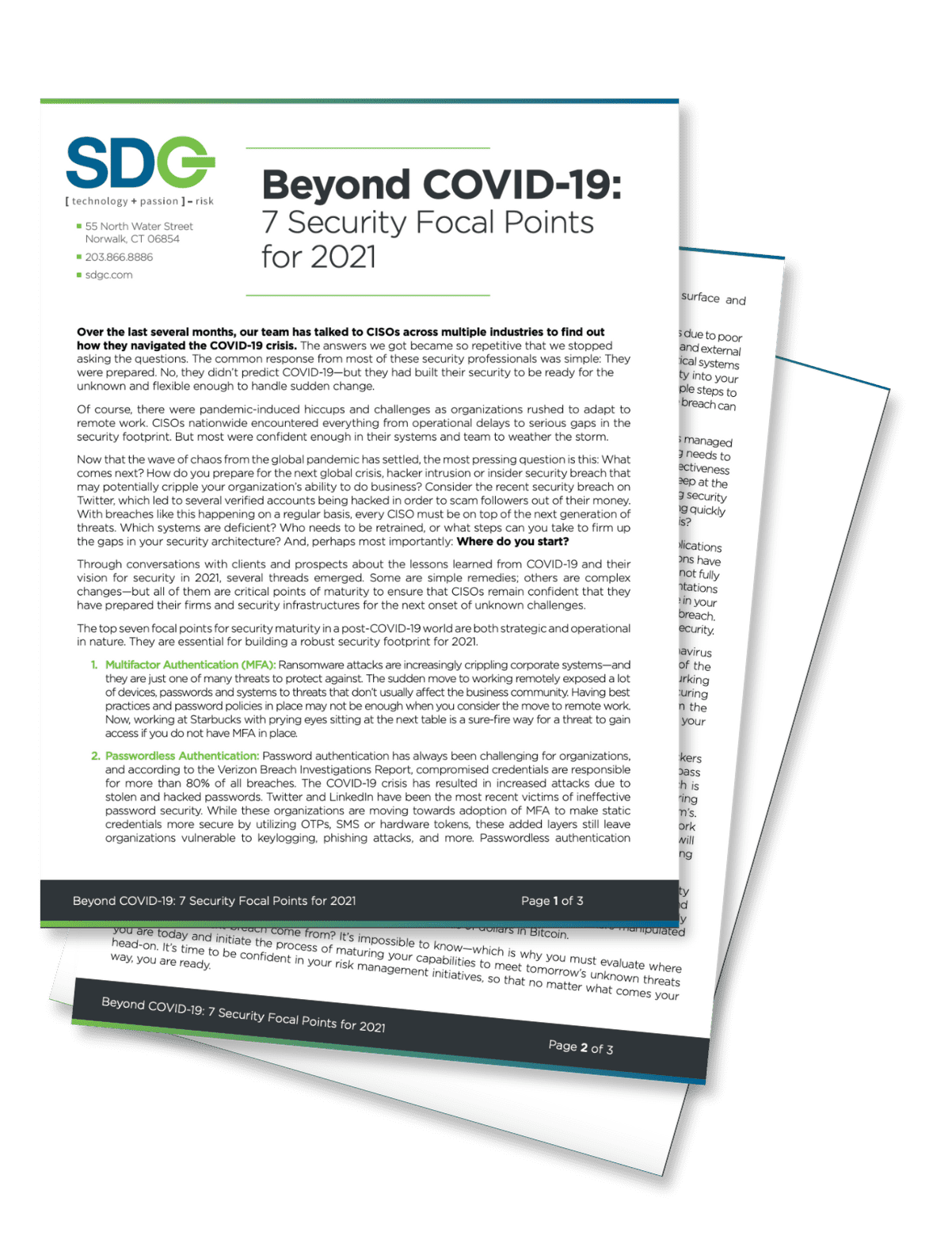Password authentication has always been challenging for organizations, and according to the Verizon Breach Investigations Report, compromised credentials are responsible for more than 80% of all breaches. The COVID-19 crisis has resulted in increased attacks due to stolen and hacked passwords. Twitter and LinkedIn have been the most recent victims of ineffective password security. While these organizations are moving towards the adoption of MFA to make static credentials more secure by utilizing OTPs, SMS, or hardware tokens, these added layers still leave organizations vulnerable to keylogging, phishing attacks, and more. Passwordless authentication 55 North Water Street Norwalk, CT 06854 203.866.8886 sdgc.com Beyond COVID-19: 7 Security Focal Points for 2021 Page 2 of 3 enhances an organization’s cybersecurity by significantly reducing the overall attack surface and virtually eliminating the risk of credential breaches.